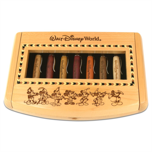 - Set includes seven pens and elegant wood display case with inlaid pattern and etched artwork of Mickey Mouse thru the years
