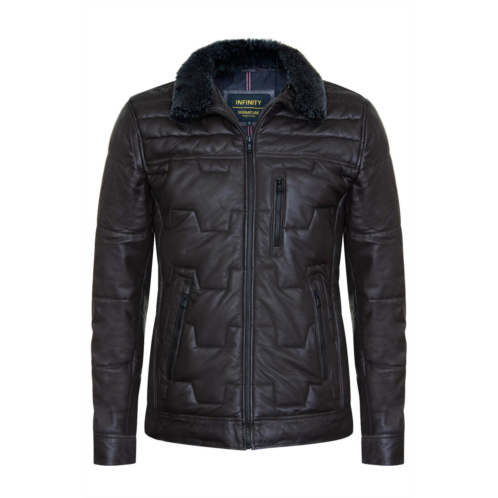 Introducing our highly anticipated Infinity Signature Range, representing two years of relentless dedication to craftsmanship and innovation. Our latest masterpiece, the striking leather jacket, boasts generous quilted padding, making it a standout piece for cold weather environments. Crafted from sumptuously soft sheep nappa leather and featuring synthetic down filling, it ensures exceptional warmth and comfort. The removable faux fur collar lining offers versatility in styling, while the sturdy UMZ zip extending to a stand collar adds durability and sophistication. With strategically placed pockets including a vertically zipped chest pocket and two handwarmer pockets, functionality meets style effortlessly. Inside, the fully nylon-lined interior reveals three leather-trimmed pockets for added convenience and organization, showcasing our unwavering commitment to luxury and practicality. Key Design Features - Dedicated Craftsmanship and Innovation - Two years of relentless dedication to craftsmanship and innovation have gone into creating this masterpiece.Premium Sheep Nappa Leather Construction with Synthetic Down Filling - Ensures exceptional warmth and comfort.Versatile Removable Faux Fur Collar Lining - Offers flexibility in styling.Durable UMZ Zip and Strategically Placed Pockets - Provide convenience and style.Luxurious Nylon-Lined Interior with Leather-Trimmed Pockets - Adds convenience and organization, showcasing our commitment to luxury and practicality