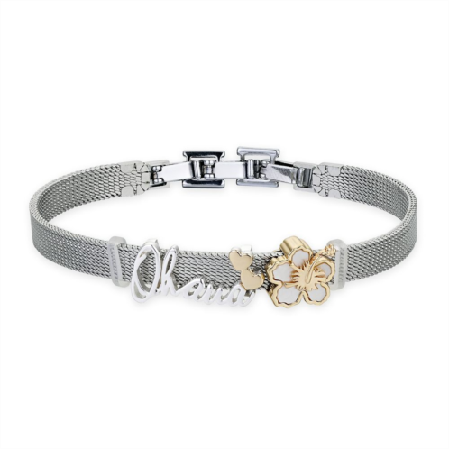 Never forget that ''ohana'' means family when you don this fine mesh bracelet. The two sliding charms feature gold and silver tones, plus mother of pearl detail on the hibiscus. This bracelet also features two extender clasps that can be removed or used to adjust sizing.
