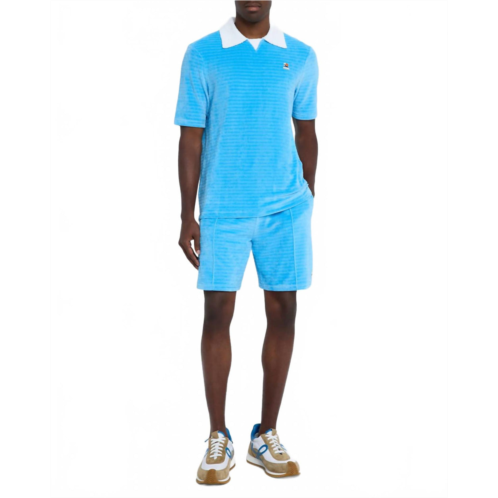 Experience luxury comfort with Casablanca's Velour Pintuck-pleated Drawstring Shorts, crafted from sumptuous velour in a chic solid blue. Designed with a regular fit, these shorts feature an elastic waistband and a gold-tipped drawstring fastening, ensuring a perfect pull-on closure and style. Made in Portugal, they offer practicality with side pockets and a back patch pocket, perfect for a minimalist summer vacation ensemble. Care - Hand wash only.
