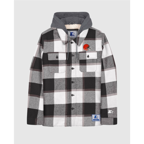 The Men's Cleveland Browns Sherpa Lined Plaid Starter Jacket by Starter is a refined blend of team spirit and cozy warmth. This black plaid jacket features long sleeves and a hooded neckline, offering a stylish yet comfortable fit. The jacket is lined with sherpa for added insulation, and it features a button closure. Adorned with the team's logo in applique and embroidery above the left chest pocket, it also includes a Starter branded logo at the cuff for a sporty finish.