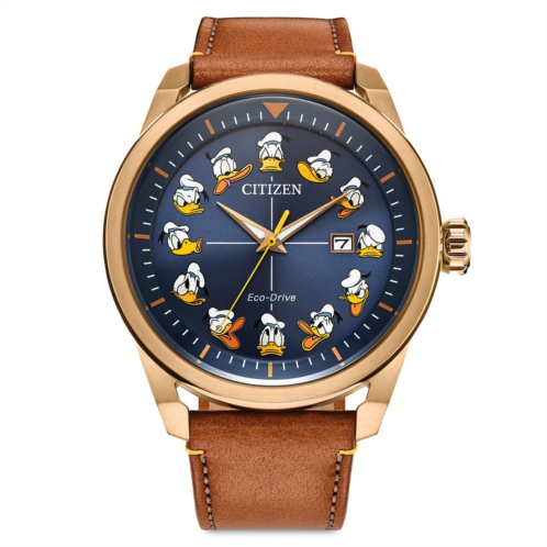 It's Donald o'clock any time of day with this classic Donald Duck watch by Citizen. The many moods of Donald represent the numerals on this stylish timepiece with a rose goldtone stainless steel case and genuine leather band. Powered by Eco-Drive technology, it can run for months once fully charged, and that should put a happy face on anybody, even Donald.
