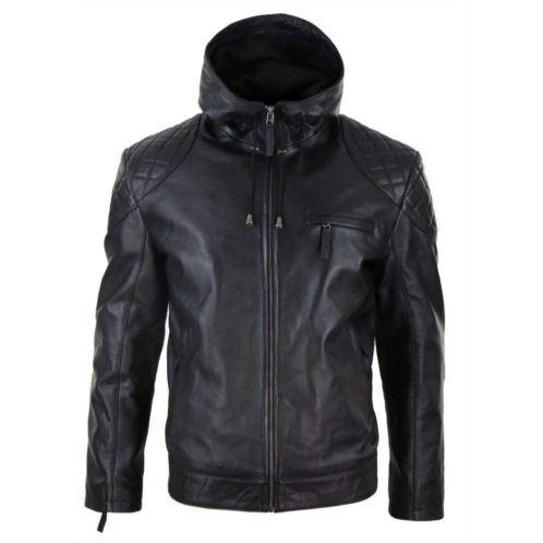 * Mens Genuine Leather Hooded Zipped Biker Jacket* Available in 2 Stunning Colours With Deatiled Design on Shoulder & Elbow Patch* Smart Casual Biker Jacket Made From Premium Soft Napa Leather* Tailored Fit (inbetween slim & regular fit), Side Zip Pockets, Chest Zip Pocket & Internal Pockets For Secure Storage* Many More Styles & Colours Available in Store!