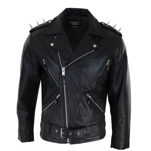 * Mens Original Cross Zip Hide Leather Jacket* Classic Retro Brando Style With Spikes On Shoulder* Premium Supple Genuine Cow Hide Leather, Style Based On True Rock N Roll* Great Casual Wear or Motorcycle Wear Jacket, Regular Fit, Waist Length, Belted DesignMaterial - Outer - 100% Leather; Lining - 100% Polyester