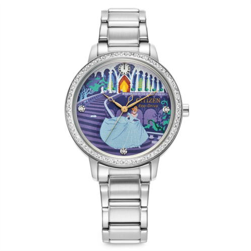 The perfect accessory to match an elegant pair of glass slippers is this Cinderella boxed set from Citizen, complete with a dreamy timepiece and collectible pin. A silvertone stainless steel case and bracelet frame the colorful dial, which displays an illustration of Cinderella losing her famed glass slipper on the palace steps at midnight. Evoking Cinderella's sparkle, the bezel of the watch is set with 78 crystals, while crystal hour markers placed at 3, 6, and 9 o'clock glimmer on the dial. The unique case back reads, ''A dream is a wish your heart makes.'' Sustainably powered by light with Citizen's Eco-Drive technology, this stylish watch never needs a battery.