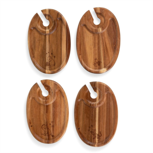 In which these charming Winnie the Pooh plates hold onto your beverage so you have a free hand to enjoy delicious appetizers or snacks. These genuine acacia wood plates have a cutout designed to hold a stemmed glass and a shallow lipped edge to keep tiny bites in place. (Glassware not included.) Elegant and durable, each plate features different art ofPooh, Piglet, Tigger and Eeyore that you and your guests are sure to love. Show of hands, please.