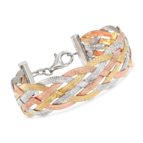 Ross-Simons is your source for affordable luxury. This reversible braid bracelet goes with everything. Using centuries-old techniques, our Italian artisans weave sterling silver with 18kt yellow and rose gold over sterling silver. The tri-colored palette mixes with all your metals. Featuring sparkling diamond cuts on one side and high-gloss polish on the reverse, it suits your every mood and occasion. 3/4' wide. Lobster clasp, tri-colored sterling silver braid bracelet. Each Ross-Simons item arrives in a fine jewelry presentation box. Shop Ross-Simons jewelry risk-free as all items include a 30-day, 100% money-back guarantee.
