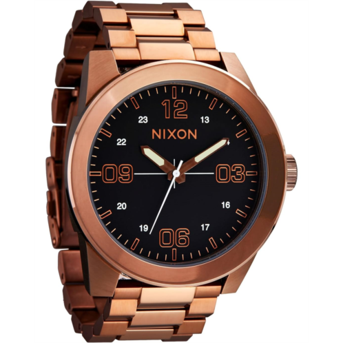- The Nixon Corporal Stainless Steel watch with a clear, tactical advantage. The face is protected by a recessed crystal and the oversized bezel brings out the best in rugged durability. It's functional design combined with details like faceted links that look like a mountain range when viewed from the side means the Corporal always has the high ground. The stainless steel watch feature Miyota Japanese Quartz three-hand and double locking foldover clasp closure.