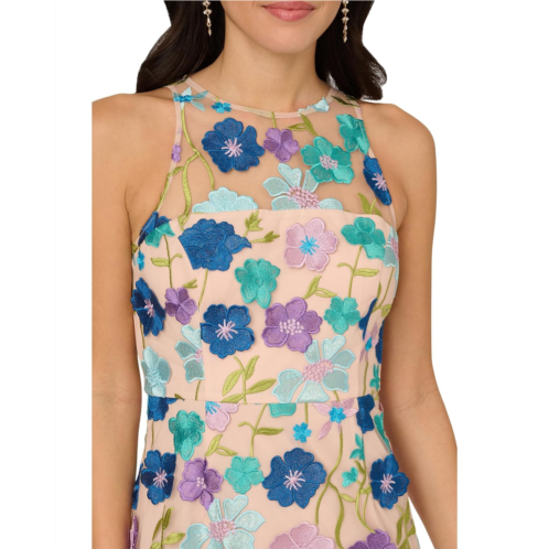 - Get ready for a fun party or casual date by wearing the Adrianna Papell Embroidered Column Midi Dress. The lace detailing on the neckline and back gives it an eye-catching appeal. This printed dress is designed with a sleeveless style and a halter neckline. The zippered back closure of the dress offers easy wear while the slit at the back makes it easy to move around. Grab everyone's attention at the party by wearing this embroidered dress.