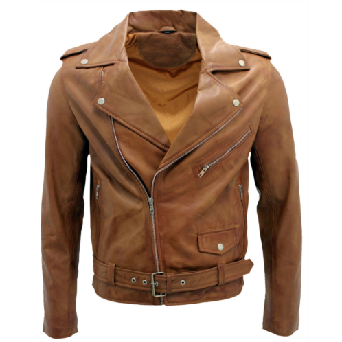 The iconic Brando jacket once again meets our premium full grain nappa leather in this eye-catching piece. Notched wide set lapels, shoulder epaulettes and an adjustable waist belt, all contribute towards making this a highly stylish piece. A slanted zip pocket is positioned across the jacket breast, with additional flap and zip pockets located at the waist and in the jacket interior. This jacket appears in earthy tan which makes for a great colourway when creating Autumn outfits and in black when you're going for a sleek, iconic look. 100% premium ultra-soft nappa leather. Four exterior and two internal pockets Features wide notch lapels and shoulder epaulettes Off centred YKK zip on the jacket front Adjustable waist belt