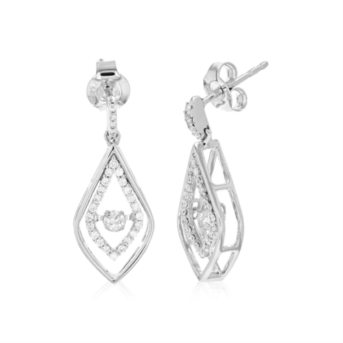Diamonds are a popular choice when it comes to dangle earrings. And what better than a lab grown diamond that has the same chemical, optical and physical properties, crystal structure and hardness as a natural diamond. Lab grown diamonds are a responsible choice since no mining is required and are just as valuable as natural diamonds. The sterling silver in the lab grown diamond dangle earrings is a very durable metal that stays shiny for a long time. The diamonds in the earring perfectly complement the sterling silver metal that has always been on the forefront of fashion.The sparkling 56 diamonds are mounted in a prong setting that securely hold the diamonds and accentuates their brilliance. Prong setting ensures that diamonds are visible and well supported, thereby offering a balance of style and durability. You can accessorize the 3/8 cttw diamond dangle earrings with any outfit and elevate your style. Charismatic and chic, the dangle earrings look nothing less than perfect. we have a 30-days easy return policy. The gorgeous dangle earrings come in a beautiful jewelry box. Committed towards making unique jewelry, we design what you demand.