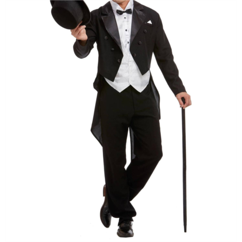 Handsomely tailored tailcoat with contrast satin lapels and pocket with attached handkerchiefIncludes satin jacquard 1920s swoop vest with attached shirtfront, bow tie, and collarTwo-piece set