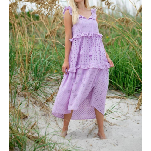 A midi dress so versatile, your options for wearing it are endless.Tiered construction. Eyelet lace. Ruffled shoulders. Sleeveless. Tassel tie neckline. Measurements - 18” bust, 17.5” waist, 48” length.