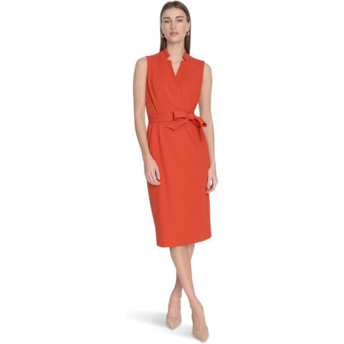 - Step out in chic style in the Calvin Klein Scuba Crepe Collar Self Tie dress. Featuring V-neckline in a sleeveless design with a self tie belt and a back zipper closure. Pair it with your favorite heels or sandals for a flawless look!