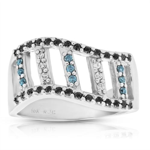 Stunning, elegant 0.35 cttw Black, Blue and White Diamond Wedding Band Ring 10K White Gold. The sparkling natural diamonds are 0.35 cttw. Blue diamonds are irradiated and black diamonds are heat treated. Gift box is included with purchase of this ring.