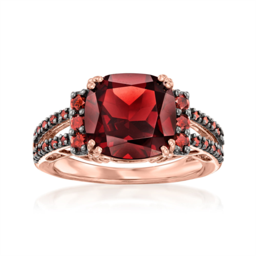 Ross-Simons travels the world to find beautiful, high-quality styles at the best prices. Adorn yourself in the richness of our divine ring. Glowing with intense color, the centered 4.00 carat cushion-cut garnet is complemented by .31 ct. t.w. red diamonds in black rhodium on a split shank setting. Crafted in polished 14kt rose gold. 3/8' wide. Red diamond and garnet ring. Each Ross-Simons item arrives in a fine jewelry presentation box. Shop Ross-Simons jewelry risk-free as all items include a 30-day, 100% money-back guarantee.