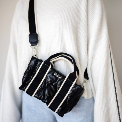 A casual and cute take on everyone's favorite crossbody bag.Perfect companion for easy, on-the-go style. Trendy crossbody features a shiny patent quilted fabric in a sleek black with chic white accents. Measuring 8' x 5' x 3.5'. Spacious enough to carry essentials like your phone and a small wallet. Equipped with an exterior zipper top and a convenient canvas strap. High-quality lightweight bag lets you go hands-free with flair.