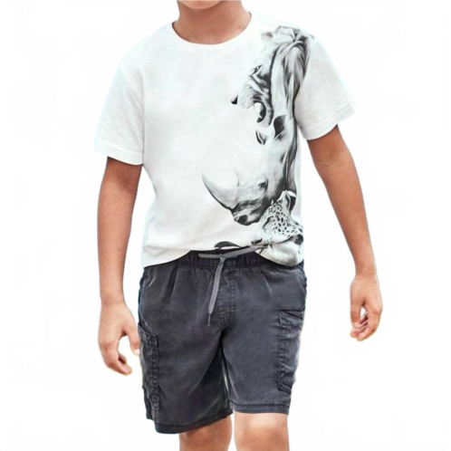Introducing the Buttery Cargo Shorts by Mayoral, designed for a carefree summer adventure. These solid Tornado-colored shorts are crafted from 100% Lyocell, ensuring a soft, lightweight feel. They feature an elastic pull-on waistband with a sporty braided drawstring and a button closure, complemented by slit pockets, large cargo pockets, and rear welt pockets for practical storage. Care Instructions - Machine wash cold, do not bleach, tumble dry low, cool iron, or dry clean.
