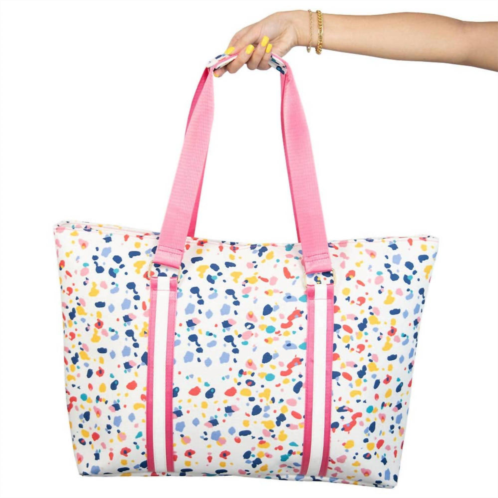 The perfect throw-it-in-and-go bag for your next weekend away or beach vacation! Its classic design will never go out of style and you'll be reaching for this bag season after season.Introducing the Confetti Tote Bag by Katydid, a playful and stylish accessory featuring a whimsical rainbow confetti print on crisp white polyester canvas. This structured bag measures 21 inches wide, 6.5 inches deep, and 13 inches high, providing ample space for your essentials. It is equipped with a zipper closure and interior pockets, while the pink handle straps offer comfort and security. The tote's water-resistant lining ensures durability, making it a practical yet chic choice for any outing.