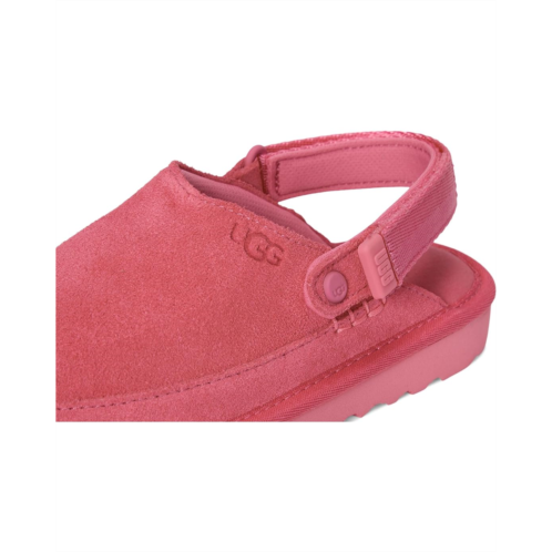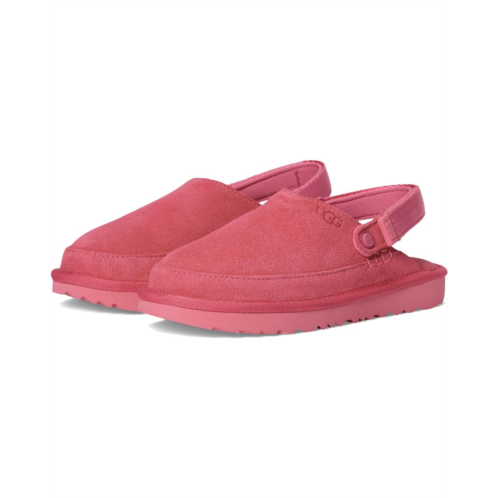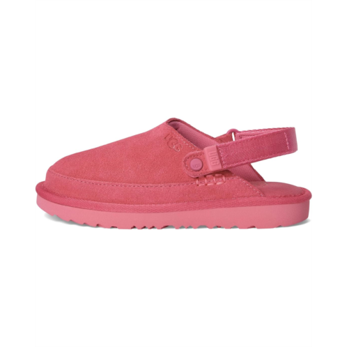 Clogs might be the shoe of the moment, but this one has the comfort your kids love from the UGG Kids Toddler Goldenstar Clogs with a suede upper and a foam footbed. These clogs come with an adjustable heel strap and hook-and-loop closure so the fit is just right for all-day play. The 100% recycled polyester lining keeps your kid's feet cool and comfortable. These clogs feature a TPU strap end with a graphic UGG font for added style. Make sure your kid experiences all-day comfort and support wearing these slide clogs.