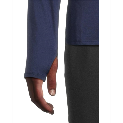 - Distraction free comfort in a go-to-layering piece. Featuring a stand collar with a quarter zip-closure, long sleeves with thumbholes, straight hemline and branding on front upper-left.