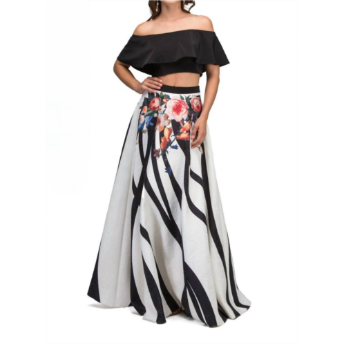 Just add a cute little clutch and a matching heel for the perfect event look.2 piece gown with crop off the shoulder top and floral/geometric print skirt.