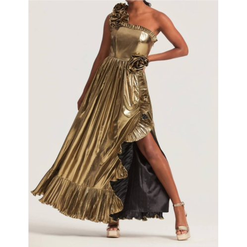 Turn heads in the cutest and most flattering evening dress.One-shoulder dress features a mixture of a shiny flat and pleated lamee fabric creating a luxe texture, sculptural lamee flowers adorn the shoulder and waist before falling to a flowing skirt with a flirty slit at the wearer’s left leg. 100% Polyester. Hand Wash Only. Flat Dry. Do Not Dry Clean. Shoulder to hem measures approx. 60.5' in length. Model is wearing a size 2. Her measurements are - Height - 5'10', Bust - 31.5', Waist - 25', Hips - 35.5'.