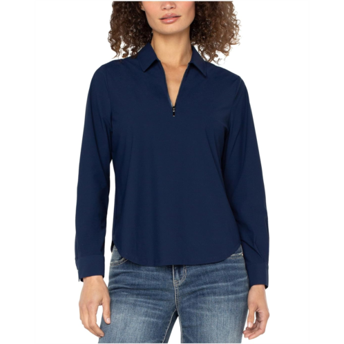 - The Liverpool Los Angeles Long Sleeve Collared Zip Front Knit Shirt is a versatile wardrobe essential that effortlessly combines comfort with classic style. Crafted from soft and stretchy knit fabric, this shirt offers a cozy and breathable feel, making it perfect for year-round wear. It has a collared neckline with a quarter-zip placket, long sleeves with buttoned cuffs, and a curved hem.