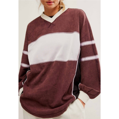 Whether you're running around town or lounging at home, this sweatshirt works for both.Elevate your sporty style with the Rugby Ready Layer Top by Free People, featuring a retro-inspired colorblock design in a chic Dark Espresso Combo. Its long sleeves and V-neckline pair beautifully with the slouchy, oversized fit for a comfortable, throw-on-and-go essential. Made from 100% cotton with polyester contrast and ribbed trimmings of 94% cotton, this top offers both comfort and durability. Closure - Pull on. Care - Machine wash. Garment Length - 77.47 cm. Bust - 129.54 cm. Sleeve Length - 74.3 cm.