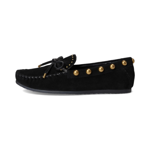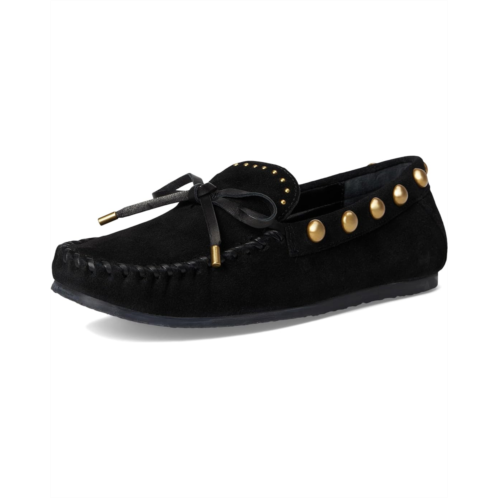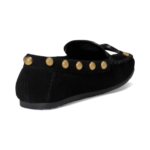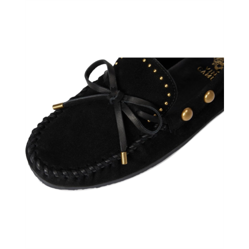 These Vince Camuto Sennett Studded Mocassin loafers blend classic moccasin styling with a bold, modern edge. The soft, suede upper is accented with intricate hand-stitched detailing, while gold-toned stud embellishments along the sides and heel add a touch of glamour. A delicate bow on the vamp enhances the feminine appeal, making these loafers a stylish yet comfortable choice for both casual and sophisticated looks. Perfect for pairing with tailored trousers or relaxed denim.