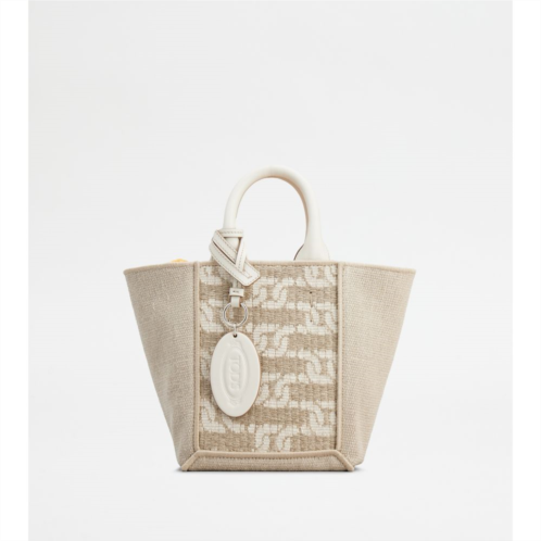 Mini shopping bag in linen and cotton, with iconic jacquard chain pattern. Featuring two leather handles fixed with maxi T-stitching, it comes with an adjustable and removable shoulder strap. The oval pendant with stamped Tod's logo enriches this creation with a refined summer mood.