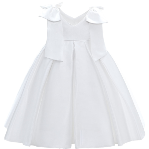 WhiteivoryPalermo satin bowpleated dress for kid and baby girls from Tulleen. A trapeze silhouette made ofsoft and lustrous satin.The highlight of this enchanting dress is the adorable matching bow accents on the shoulders. These dainty bows add a touch of whimsy to the outfit.