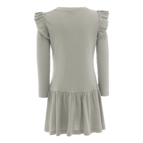 Green sagelong sleeved modalruffle dress for kid and baby girls from BANBLU, featuring a soft and comfortable cotton modal blend, round neck, pleated skirt and ruffled sleeves.