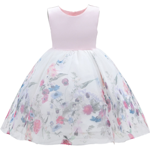 PinkMabel floral garden organza dress for kid girls from Tulleen. The Mabel Dress boasts a sleeveless satin round neck bodice that offers both comfort and elegance. The magical centerpiece of this dress lies in its dreamy white lightweight tulle skirt adorned with a mesmerizing floral garden design. The intricate patterns come alive with a burst of vibrant floral colors.
