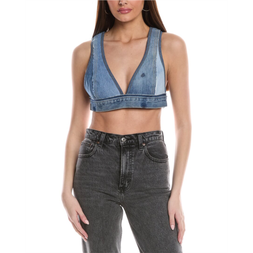 Introducing the RE/DONE Denim Bra, a must-have addition to your wardrobe for effortlessly cool style. This top features a stunning Tinted Indigo color, a plunging neckline, and a snap closure for easy wear. Made from 100% cotton and measuring approximately 13 inches from shoulder to hem, this top is perfect for everyday wear. The model is 5'11 and is wearing a size small, with measurements that may vary slightly by size. This top is machine washable and proudly made in the USA, making it a versatile and sustainable choice for your wardrobe.