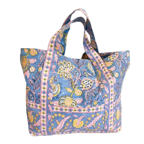 The carry-all tote bag of the season. Get in vacation mode with this perfectly sized tote bag that is the perfect accessory for beach days, pool parties, or sunset dinners.Elevate your beach days with the Bell by Alicia Bell Medium Beach Bag, crafted for style and utility with a striking blue and yellow block print. Made in India, this tote features a robust canvas exterior with a waterproof technical weave lining to keep your belongings safe. It's designed with an open top for easy access and an abstract pattern to add flair. Measuring 12.5 inches in height, 18.5 inches in length, 6.25 inches in depth, and a handle drop of 4.75 inches, this lightweight 6oz bag ensures you're well-equipped for your sunny adventures.