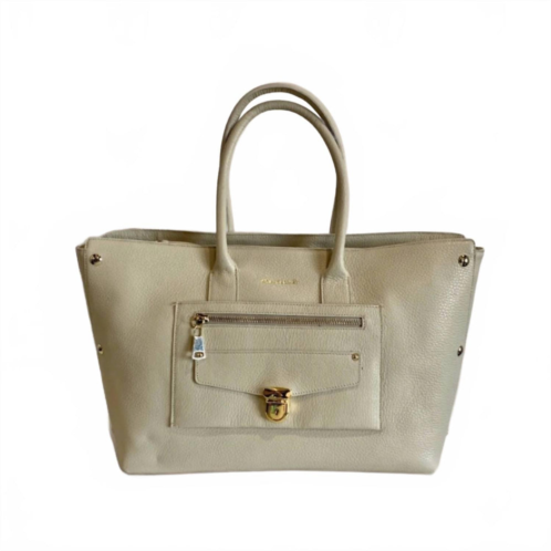 The carry-all tote bag of the season. Get in vacation mode with this perfectly sized tote bag that is the perfect accessory for beach days, pool parties, or sunset dinners.Introducing the Grazia Leather Bag by Berge, a luxurious tote meticulously crafted from pebbled Italian leather in a chic beige hue. This exquisite piece features dimensions of 18' in length, 10' in height, and 6' in depth, with gold stud detailing and a zip-top closure for secure storage. Handmade by Italian artisans, it includes an exterior zip pocket, an inside zipped pouch, and two sewn-in interior pockets, making it a perfect blend of style and functionality. Made in Italy, the bag also offers a detachable long leather strap for versatile shoulder carrying.