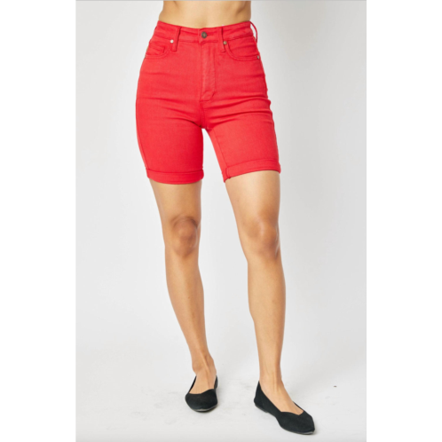 Embrace the perfect blend of comfort and style with these fashionable women's Bermuda shorts, expertly designed to offer a flattering fit and versatile wear.These Garment Dyed Tummy Control Bermuda Shorts feature pockets and a zip closure. They are made from 93% cotton, 6% polyester, and 1% spandex. The rise is 11', with a 7.25' inseam when cuffed and 9.25' inseam when uncuffed.