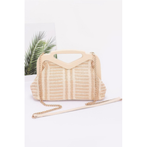 Make a lasting impression with the Faux Straw Wood Frame Clutch, a modern interpretation of a timeless design. Showcasing a textured faux straw body with a bold wood-look frame, this striped clutch blends natural charm with contemporary appeal. Finished with a detachable chain strap, it easily transitions from relaxed daytime outings to polished evening occasions.