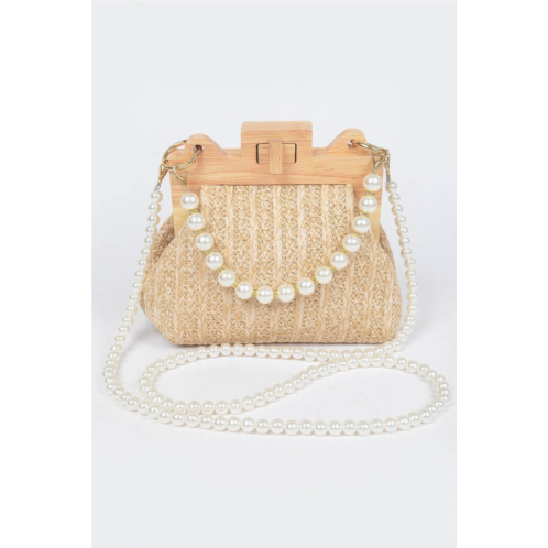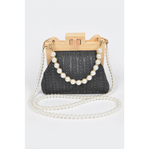 [US] FASHNZFAB faux straw wood frame clutch w/ faux pearl chain