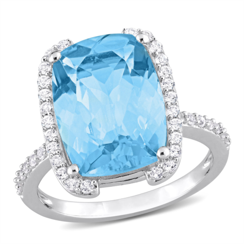 Make a statement with this gorgeous cocktail ring that showcases a cushion-cut sky-blue topaz surrounded by white topaz accents. The sky-blue topaz has a total weight of 9 2/5 carats and is set in sterling silver with a high polish finish. The white topaz stones add extra sparkle and contrast to the ring and have a total weight of 1/4 carat. This ring is sure to turn heads and impress with its stunning color and size.