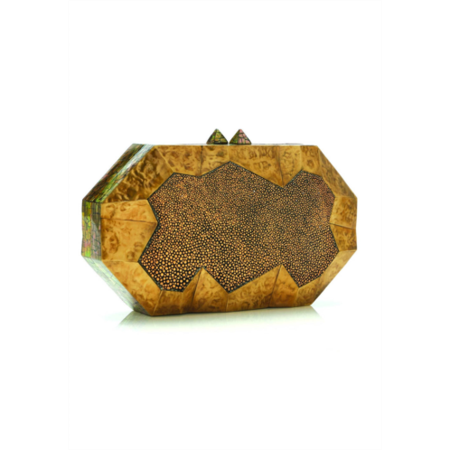 The perfect clutch for an evening out on the town.Introducing the Women's Viera Clutch Bag by Emm Kuo, an architectural masterpiece in a striking hexagonal design. Crafted from exquisite hammered brass with gold stingray and a mother of pearl frame, this clutch fits comfortably in hand while accommodating an iPhone 7+. It features a strong magnetic closure and comes with a detachable chain for versatile wear. Dimensions - 190mm x 100mm x 44mm.