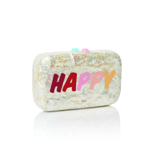 Don't be mistaken by its size, this little bag holds more than you'd expect!Elevate your accessory collection with the Women's Collins Clutch Bag by Emm Kuo, a conversation starter that champions positivity. This multi-colored piece features vibrant 'Happy' and 'Smile' motifs in colorful resin, inlayed on an exquisite mother of pearl exterior. The interior is lined with black satin and comes with a detachable silver snakechain for versatile usage. Dimensioned at 180mm x 110mm x 44mm, this clutch ensures you stay fashion-forward and joyful.