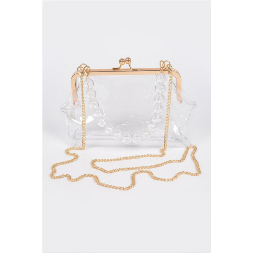Make a chic statement with the Vintage Clasp PVC Clutch, a sophisticated blend of modern minimalism and vintage-inspired design. Crafted from clear PVC with elegant polyurethane trim, this clutch lets you display your essentials in style while keeping them secure. The standout gold-tone clasp and matching chain strap add a refined touch of glamour, making it perfect for evenings out, special events, or elevated everyday wear. Compact yet functional, it offers just enough space for your must-haves without compromising on elegance. Whether held as a clutch or worn over the shoulder, it’s a polished piece that complements any ensemble.
