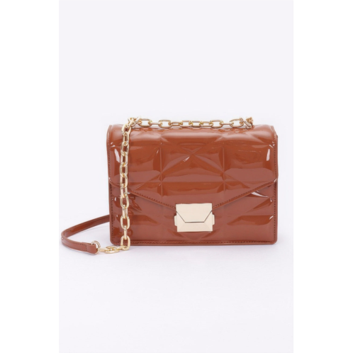 Elevate your ensemble with the Enamel Elegance Crossbody Clutch, a sophisticated accessory that combines embossed enamel styling with a structured design. The patent-like finish and gold-tone chain strap create a refined contrast, perfect for both evening and formal occasions. Its compact flap-over design keeps your items secure while making a statement. Versatile and chic, it can be worn as a crossbody or carried as a clutch.