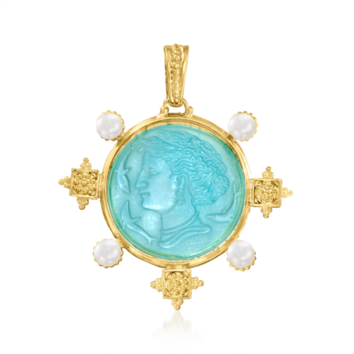 Ross-Simons travels the world to find beautiful, high-quality styles at the best prices. The skilled Italian artisans at Tagliamonte have proven themselves superior again, this time with an incredibly regal pendant that will take center stage in any setting. Features an ocean-blue 30mm round Venetian glass, carved with a cameo, embellished with 5-6mm cultured freshwater button pearls and imperial 18kt yellow gold over sterling silver detailing along the outer edge. Hinged bale fits up to a 6.5mm chain, sold separately. Hook safety. Tagliamonte blue Venetian glass pendant. Each Ross-Simons item arrives in a fine jewelry presentation box. Shop Ross-Simons jewelry risk-free as all items include a 30-day, 100% money-back guarantee.