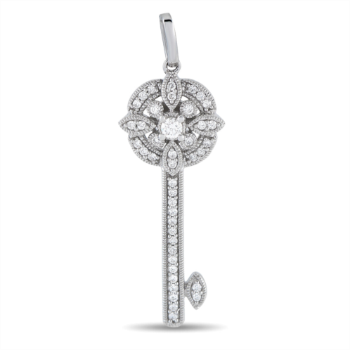 Stylish and symbolic, this diamond key pendant offers a mix of thoughtfulness, versatility, and elegance. An LB Exclusive piece, it is crafted in 14K white gold and finished with milgrain trim. The 1.25 by 0.5 pendant is fully embellished with round diamonds weighing 0.25 carats in total.This brand new LB Exclusive 14K White Gold 0.25 ct Diamond Key Pendant comes with a gift box.