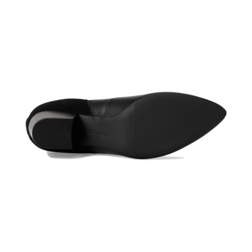 Exude sleek sophistication wearing the Clarks Ellanie Vibe Boots, designed in a pointed toe silhouette with a solid block heel. The ankle-high boots are crafted with a black leather & suede upper, mesh lining, and a 5mm Ultimate Comfort foam footbed that delivers lasting cushioning. The side zipper closure ensures a secure fit.