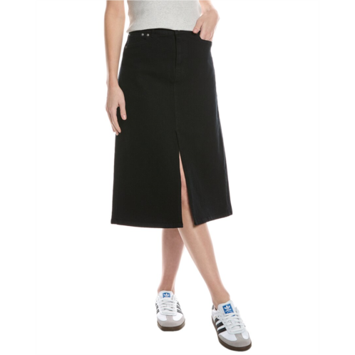 Introducing the Proenza Schouler White Label Denim Midi Skirt, a stylish and versatile piece for your wardrobe. This black denim skirt features classic five-pocket styling, belt loops, and a chic split hem design. Made from a blend of cotton and spandex, it offers a comfortable fit with a zip fly and button closure. The skirt measures approximately 30 inches from waist to hem and comes with a lining made of cotton, nylon, and spandex. Whether dressed up or down, this midi skirt is a must-have addition to any fashion-forward woman's collection. Imported and 100% genuine, this Proenza Schouler White Label skirt guarantees quality and authenticity in every wear. Model is 5'10 and is wearing a size 2. Please note that measurements may vary slightly by size. Machine washable for easy care and maintenance. Elevate your look with this fashionable denim skirt today!