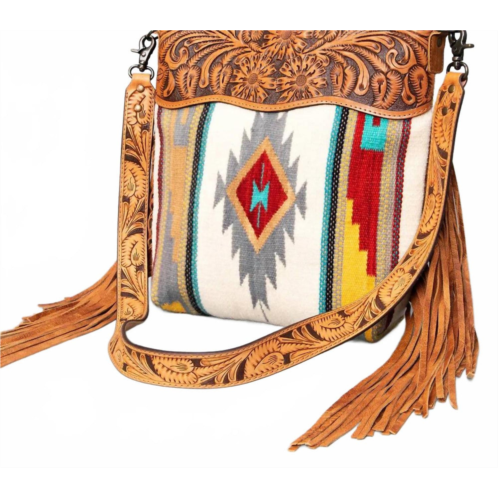 A casual and cute take on everyone's favorite crossbody bag.Introducing the Women's Large Crossbody Messenger Bag by American Darling, a masterpiece of craftsmanship in multi-color. This bag features meticulously hand-tooled and carved details on genuine full-grain leather, enriched with a hand-weaved wool saddle blanket for a trendy yet traditional look. It includes an adjustable leather strap with hand-tooled patterns and is adorned with elegant leather fringes, adding a distinctive western flair. Secured with durable YKK zippers and antique-finish metal fittings, the bag provides longevity and style. Size - 15in (H) X 15in (W) X 3in (D).